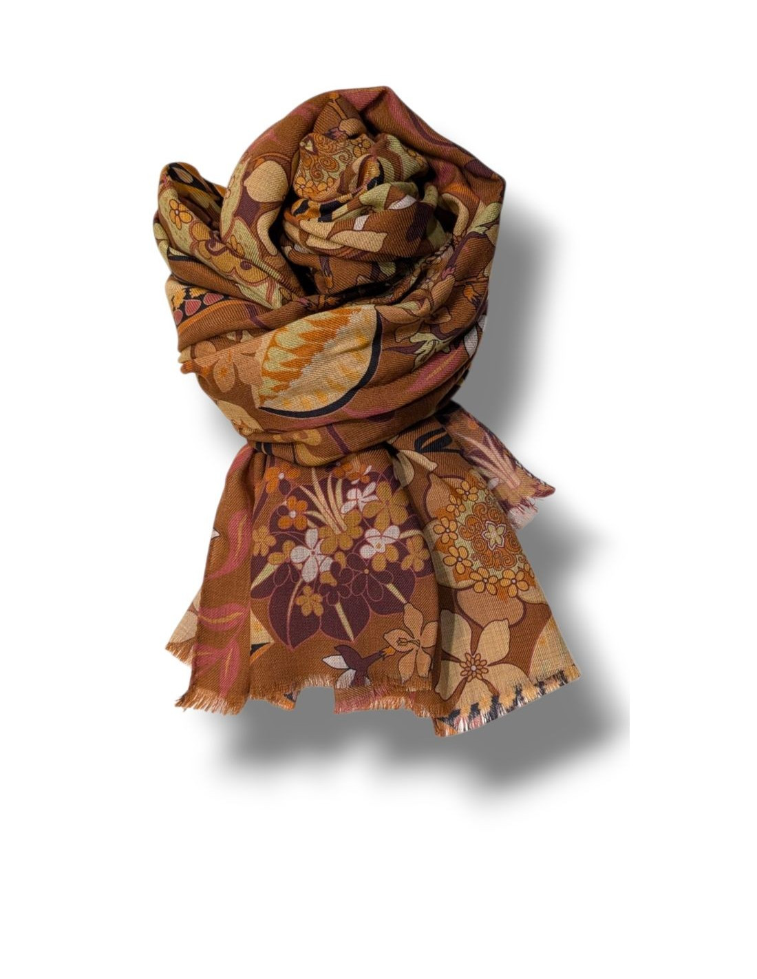 Foulard unisex con patrón estampado floral en colores marrones, naranjas y verdes.